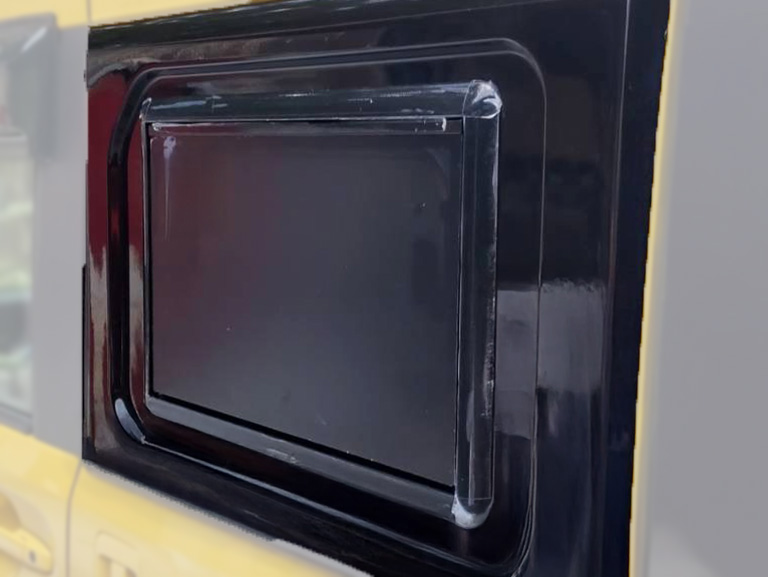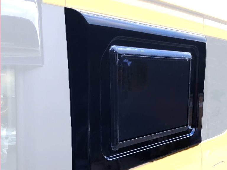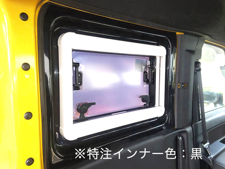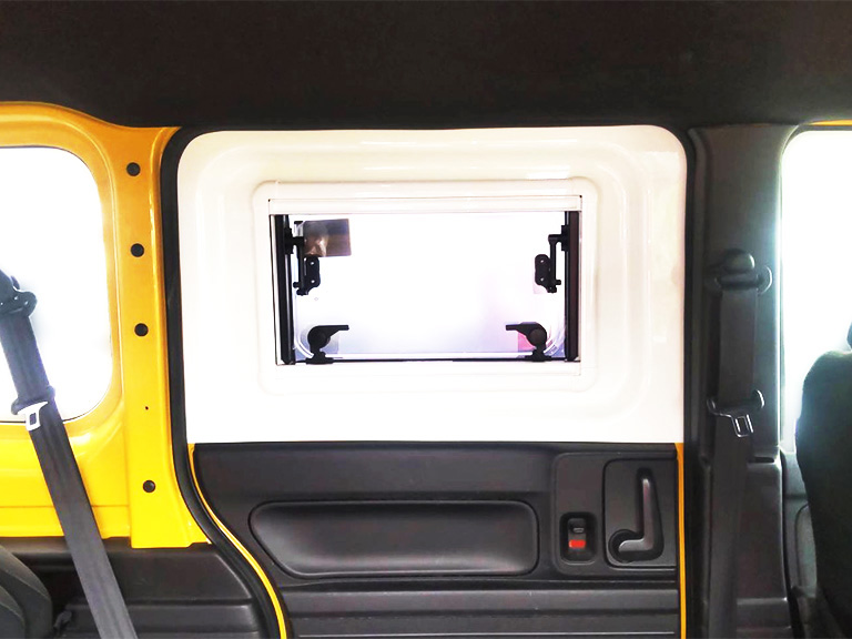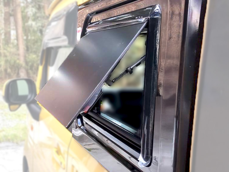 左スライドドアのウィンドを外しFRPエクステンション窓付きを取り付けることで、車内換気ができるようになります。