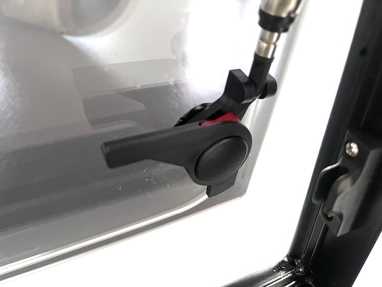 ステンレス鋼ストラットロッドは無段階に調節可能です。ストラットロットには、赤いボタンがついており、ロックすることができます。