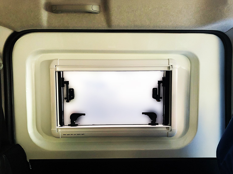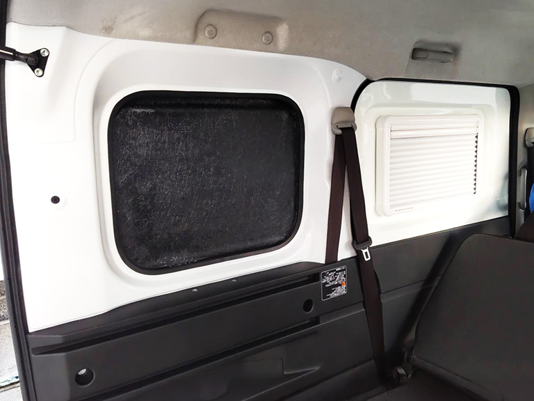 左スライドドアのウィンドを外しFRPエクステンション窓付きを取り付けることで、車内換気ができるようになります。