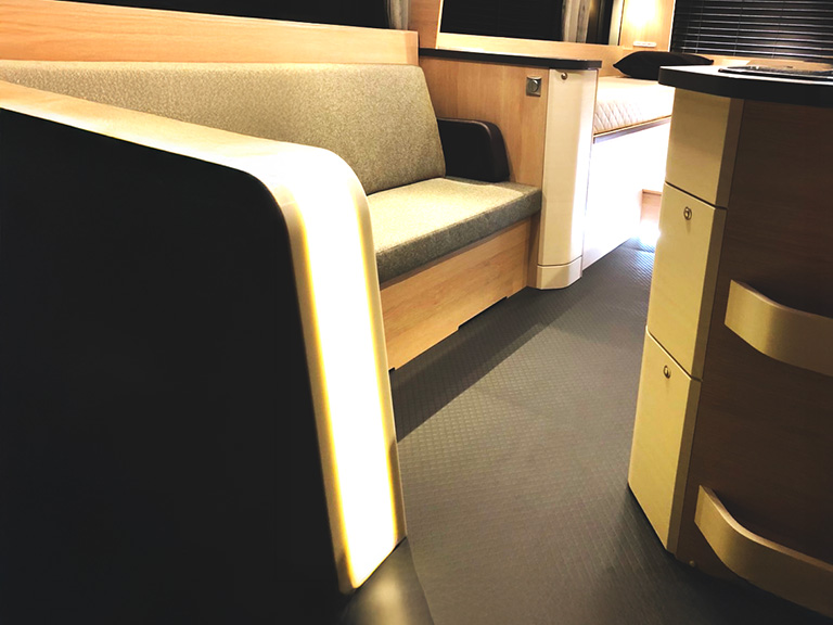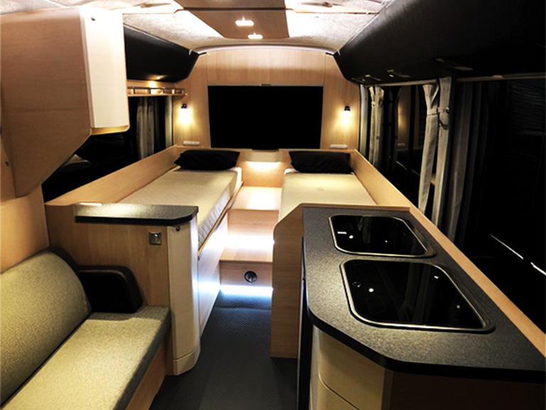 キャンピングカー「バスコン」製作 2025.09.03CATEGPRIES02 企画からデザイン、設計図、試作車製作、登録資料、量産製作まで一貫して自社で作業を行っております。樹脂曲げなどを行い、エントランス照明などを作りオリジナリティあるインテリアも製作します。 バスコン2-2